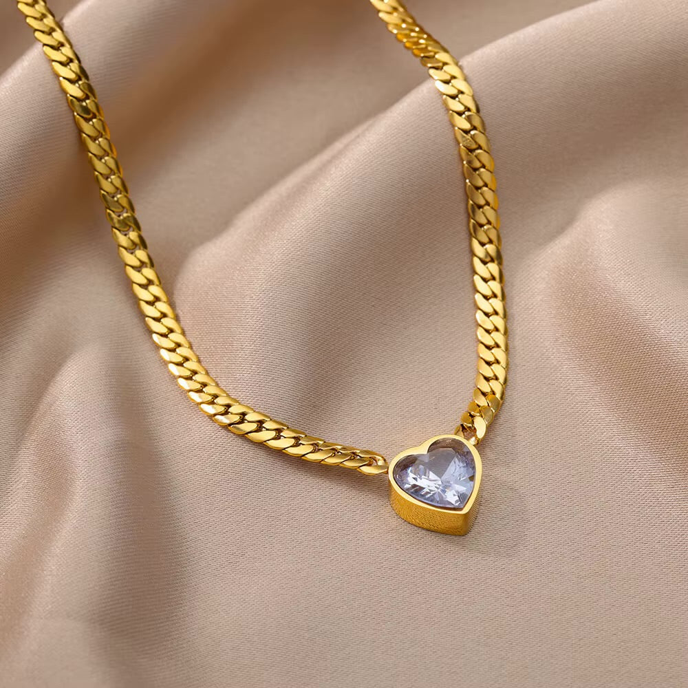 A delicate gold chain necklace featuring a heart shaped crystal centerpiece that adds a soft,...