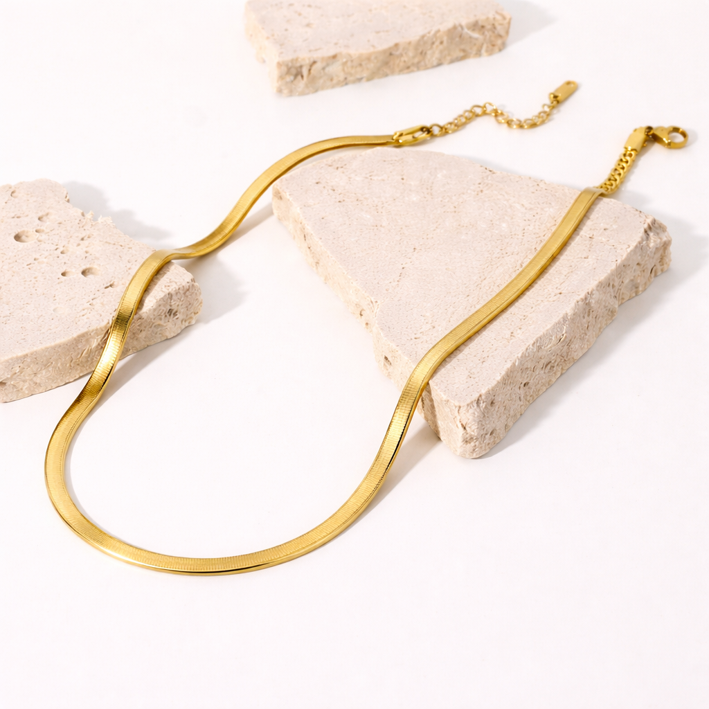 A sleek gold steel herringbone (snake) chain necklace designed with a smooth, modern finish that...