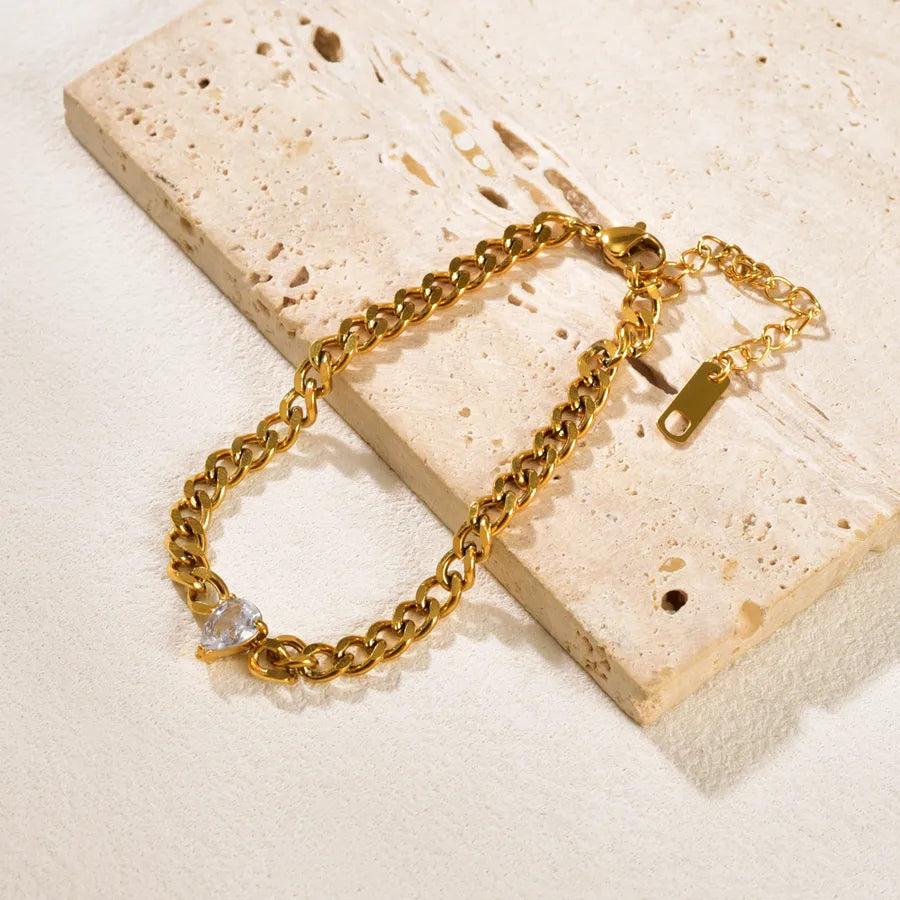 A sleek, modern gold chain bracelet featuring a single diamond shaped like a delicate water...